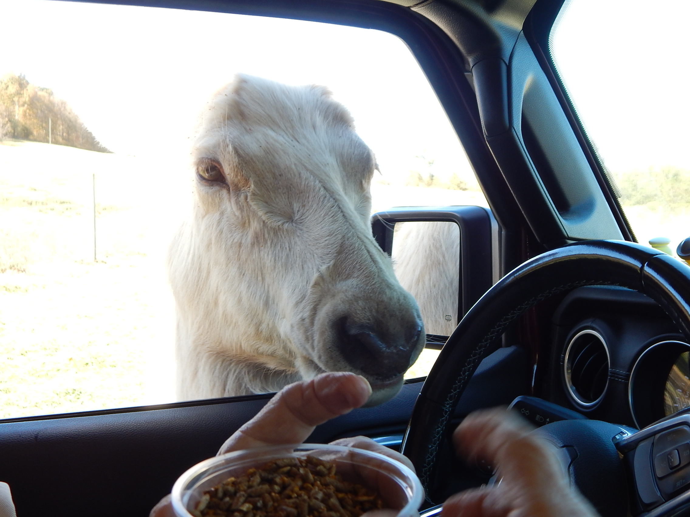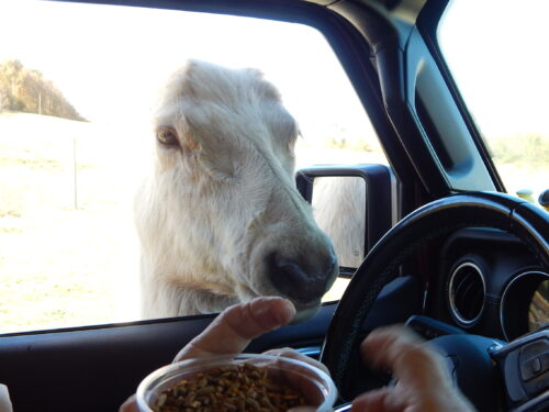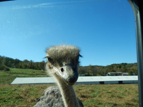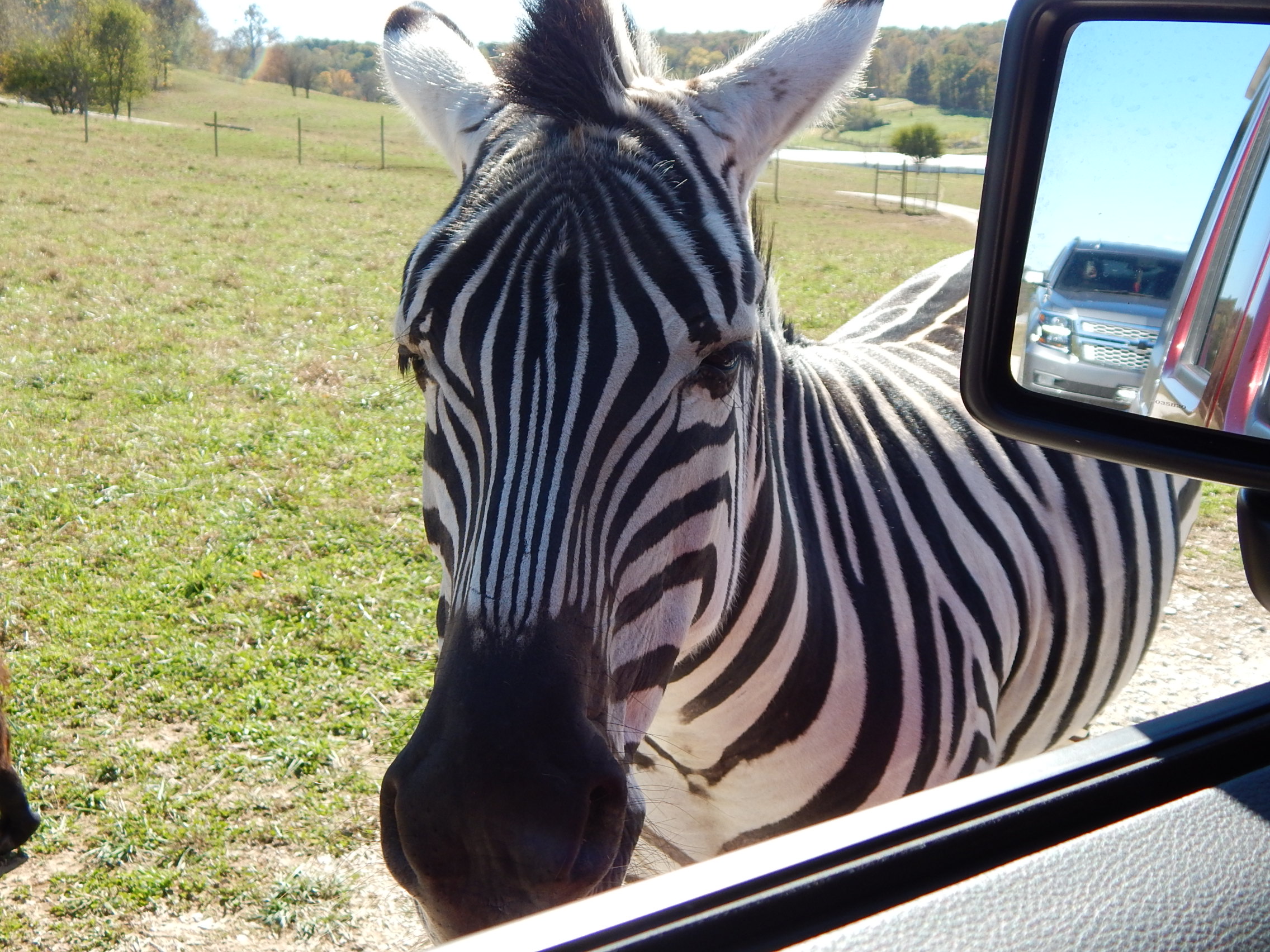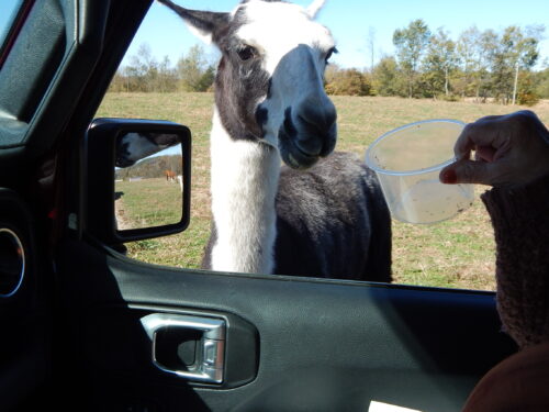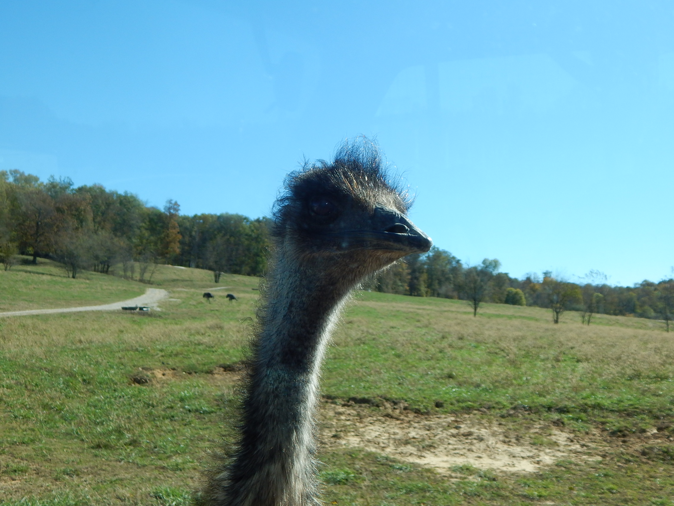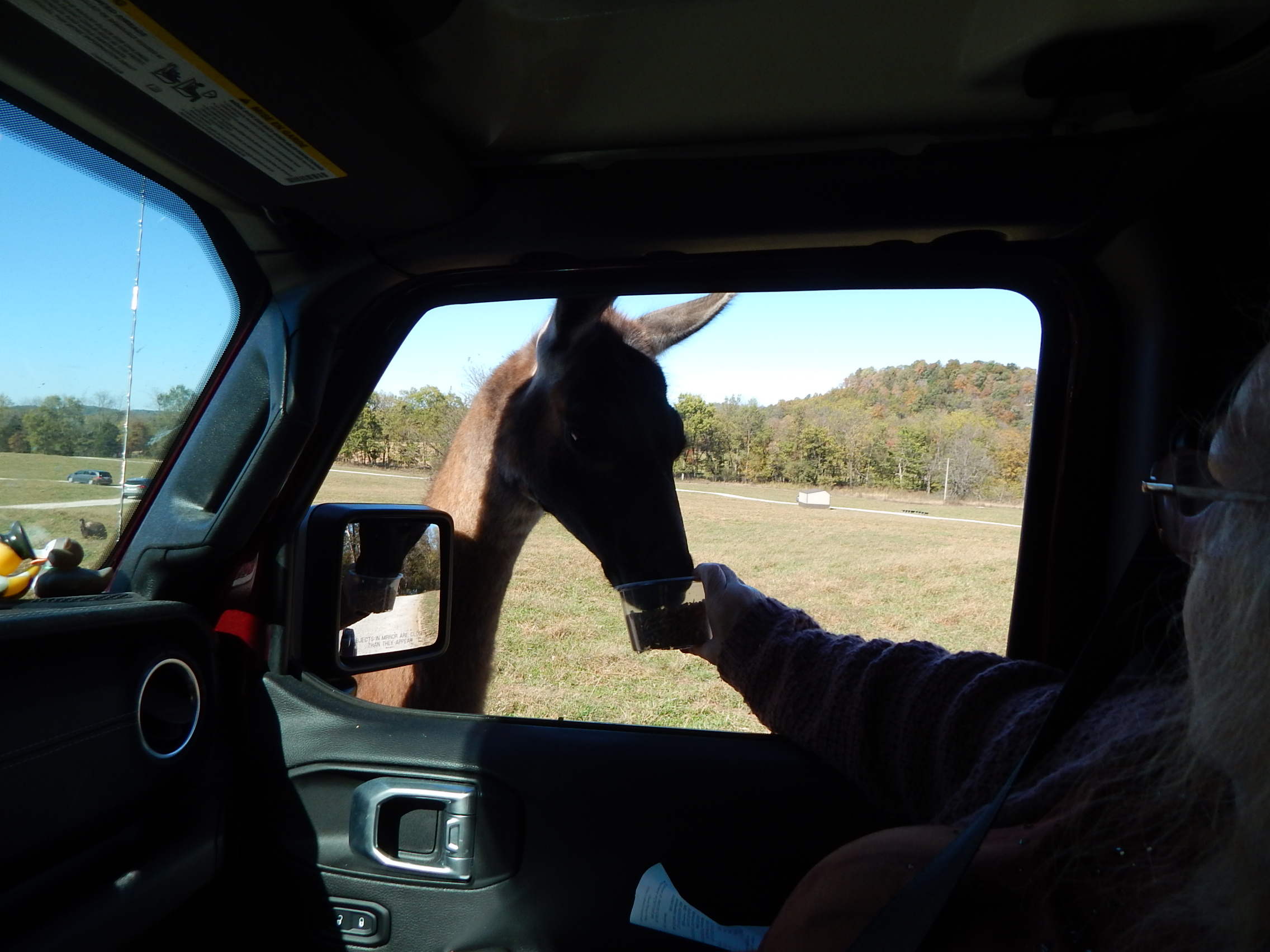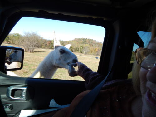 So October came and went fast as every other month in this year has gone.  David and I did a couple of road trips and went down to French Lick where this animal ranch is. We have been down there before on our fiftieth wedding anniversary where we stayed in this grand hotel.  We visited the zoo and got up close to elephants and even got to touch them.  This time we went on an animal safari where we drove this road into this enclosure where animals waited to get treats from each car.  We bought two cups  of their feed and proceeded in to their area.  A camel came right up to the window on David’s side and David  stuck the cup out his window and the camel took the whole thing out of his hand!