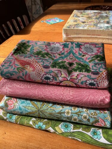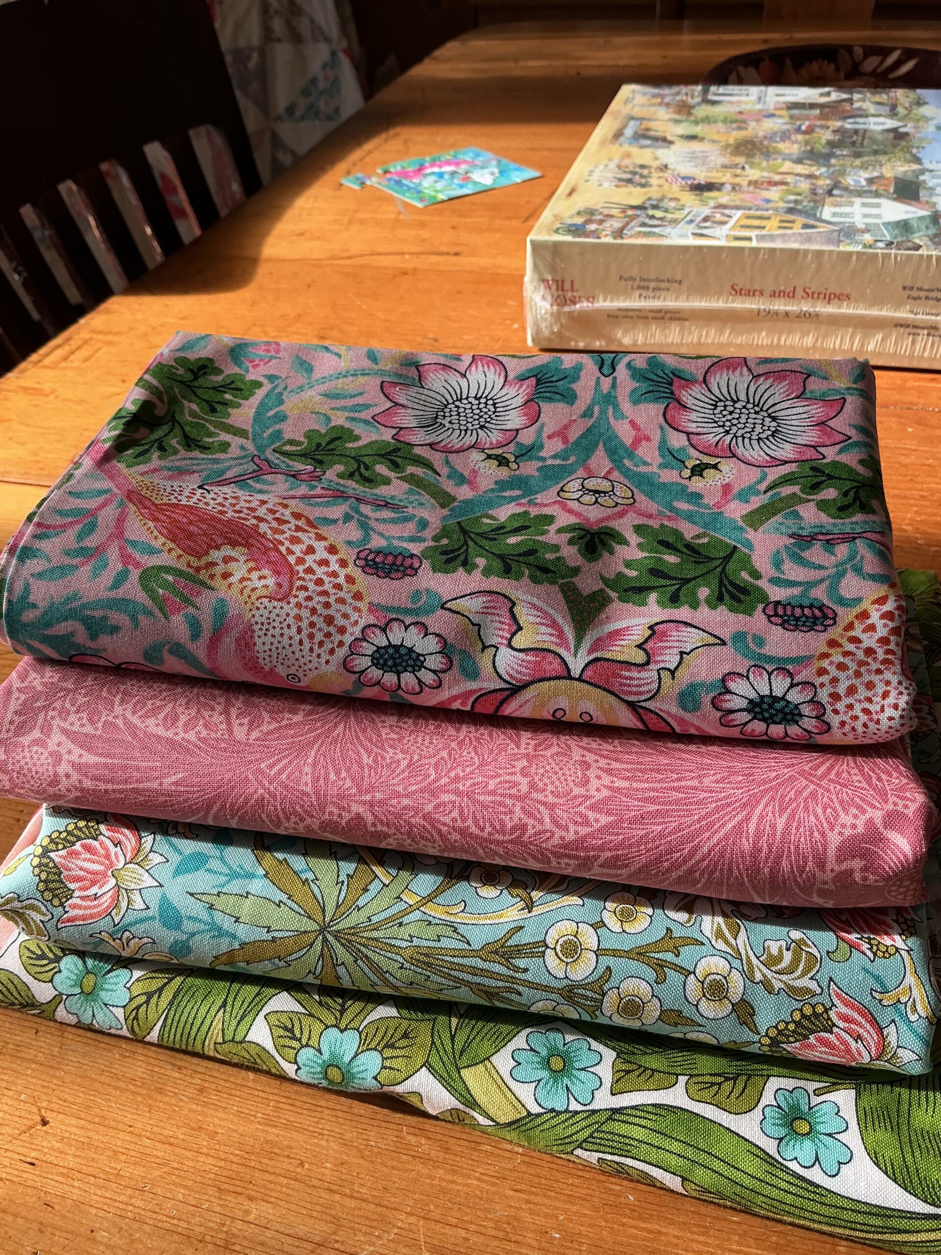 We also had one of the worst snowstorms we have had in years. Guess it was a good time to be cooped up in the house. We didn’t feel like going anywhere, anyway. I hope we have turned a corner. I hadn’t felt like doing any sewing for weeks, but a couple of days ago I did get out to my shop and worked on a couple of quilts. I joined this fabric group where I receive 6 fat quarters of William Morris inspired fabric every month. William Morris was a designer of wallpaper back in the 1800’s and he made some very beautiful designs. Now his designs are on fabric. I am making a small quilt every month using that month’s fabric using the same pattern for each one and when I have enough made, I will sew them all together in one patchwork quilt. It is going to be interesting because I never know what colors of fabric I will get.
