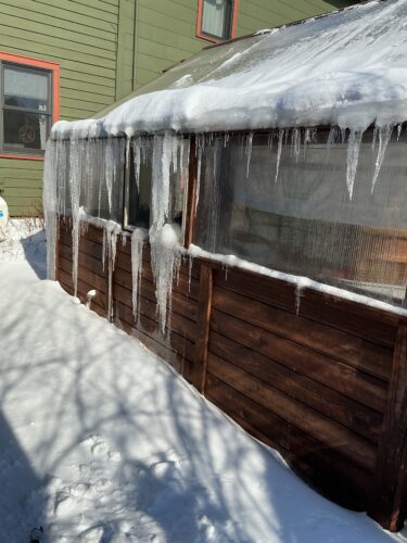 This is what my greenhouse looked like a couple of weeks ago. We have been in a frozen tundra for days, but next week it is supposed to get up to the forties. Indiana weather. You never know what you are going to get! I wish you could see the flowers in there. I will have to get some pictures taken. There is a petunia that has taken up one whole corner of the greenhouse, the poinsettia is doing wonderfully and I have a couple of huge geraniums that seem to love it in there. I must say, our little gas furnace we put in there is keeping everything toasty warm. No insulation at all.