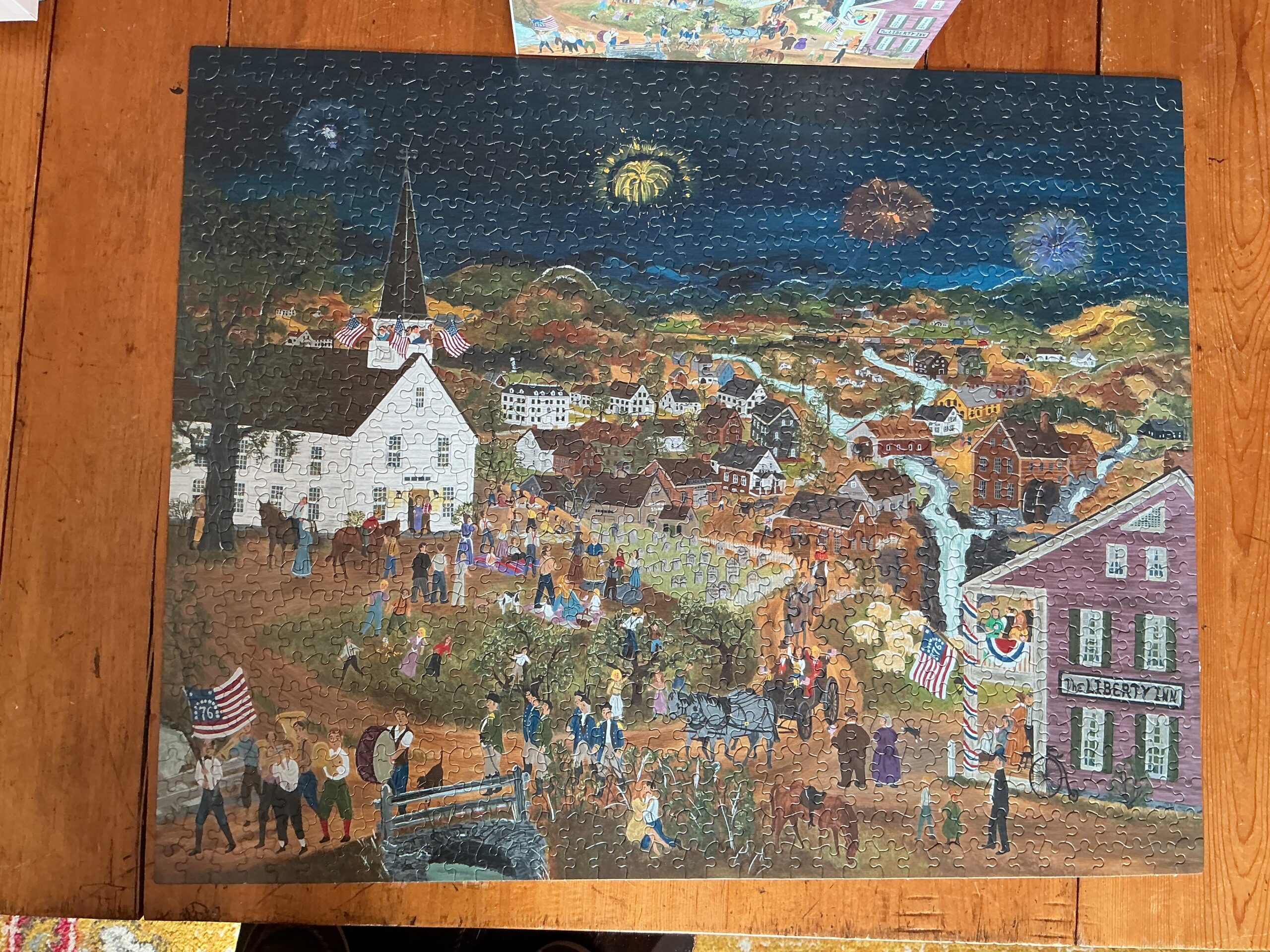 David finished a puzzle today. A Will Moses puzzle. Will Moses is Grandma Moses grandson, I think. His paintings are very like hers were. David said this one was a little harder because there was so much dark in it.